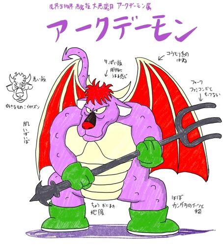 昔からいろんなゲームにアークデーモンって名前のモンスターが登場するが、2020年現在、世間の代表的なアークデーモンはこいつだった(google調べ)。 ドラクエ2の終盤に出てくるめっちゃ強いモンスター。牛のような顔に爬虫類のような皮膚。コウモリ型の翼…